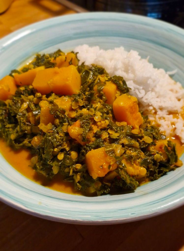 Den Grünkohl hinzugeben und rühren bis er etwas zerfallen ist. Butternusskürbis und Linsen hinzugeben und gut durchrühren.
