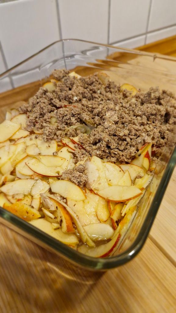 Die Streusel über die Apel-Birne-Mischung geben und im Backofen mittleren Schiene 25 Minuten backen.