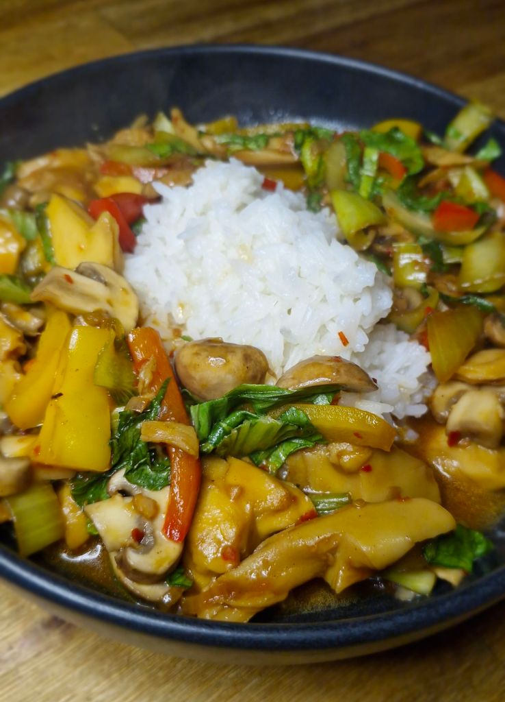 Zwiebeln anbraten. Das Soja-Chicken mitbraten. Wenn es schön Farbe hat, die Paprikastreifen hinzufügen und nach 2 Minuten die Thaicilis und die Champignons. Beim anbraten der Chilis könnte Hustenreiz ausgelöst werden.